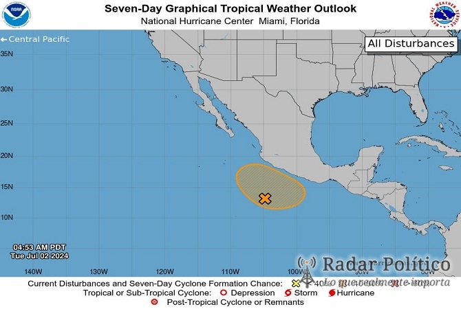 De igual forma, se da a conocer que se continúa monitoreando la amplia zona de baja presión, la cual incrementa gradualmente su probabilidad para desarrollo ciclónico debido a las condiciones ambientales: «Quiero informar que en los próximos días este fenómeno, localizado en el Pacífico, podría convertirse en depresión tropical mientras se desplaza de norte a noroeste; actualmente, presenta un 30% de probabilidad a 48 horas y un 50% a 7 días», explicó Jesús López Armenta, jefe de monitoreo.