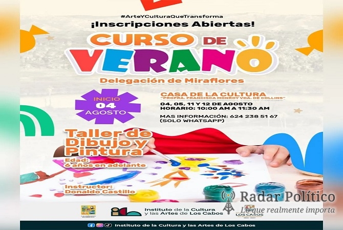 Los Cabos, BCS.- El XV Ayuntamiento de Los Cabos, que encabeza el presidente municipal Christian Agúndez, a través del Instituto de la Cultura y las Artes (ICA) invita a la niñez a participar en los cursos de verano que iniciarán en agosto en la delegación de Miraflores.