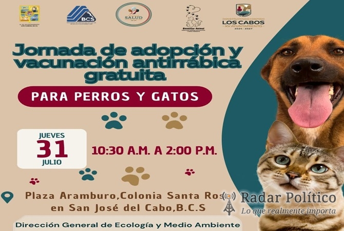Los Cabos, Baja California Sur.– Con el propósito de fomentar la adopción responsable y promover el bienestar animal, el XV Ayuntamiento de Los Cabos, que encabeza el presidente municipal, Christian Agúndez, a través de la Dirección General de Ecología y Medio Ambiente, llevará a cabo este miércoles 31 de julio la Primera Jornada de Adopción y Vacunación Antirrábica en San José del Cabo.