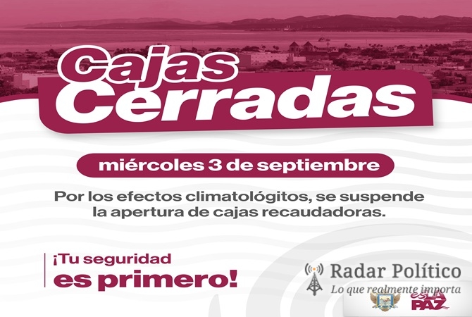 El XVIII Ayuntamiento de La Paz, a través de la Tesorería Municipal, anuncia la suspensión temporal de las actividades recaudadoras en todo el municipio, como medida preventiva ante los efectos del huracán Lorena.