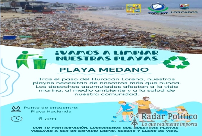 Los Cabos, Baja California Sur.- Ante las afectaciones generadas por el paso del huracán «Lorena», el XV Ayuntamiento de Los Cabos que preside Christian Agúndez Gómez, a través de la Zona Federal Marítimo Terrestre (Zofemat), implementará este jueves 04 de septiembre una campaña de limpieza en la playa El Médano, en Cabo San Lucas.