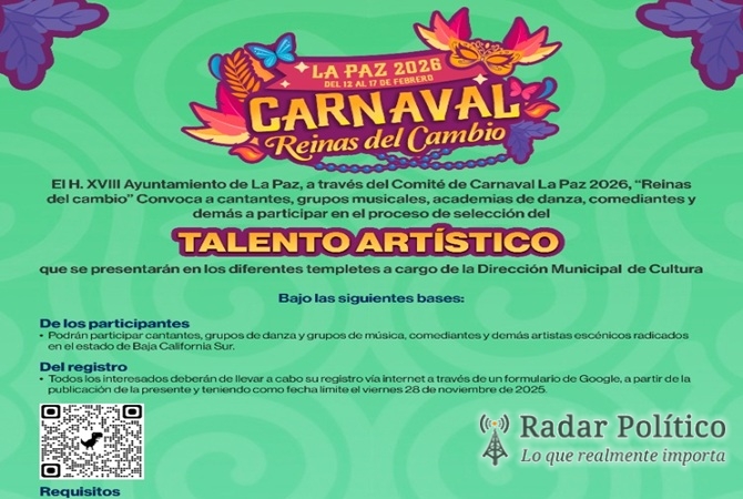 El XVIII Ayuntamiento de La Paz, a través del Comité de Carnaval convoca a cantantes, grupos de danza y grupos de música, comediantes y demás artistas escénicos que radiquen en el Estado, a participar en el proceso de selección del talento artístico que se presentará en el Carnaval La Paz 2026 “Reinas del Cambio”.