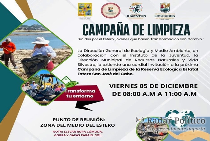 Los Cabos, Baja California Sur.– En seguimiento al compromiso de proteger y fortalecer la Reserva Ecológica Estatal Estero San José del Cabo, el XV Ayuntamiento de Los Cabos, a través de la Dirección General de Ecología y Medio Ambiente, realizará una nueva jornada de limpieza este viernes 05 de diciembre.
