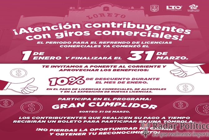 Loreto, B.C.S. 9 de enero, 2026.- Con la finalidad de facilitar la regularización de todas las personas o establecimientos que realizan actividades comerciales, el período para el refrendo de licencias con giros comerciales, estará vigente del 01 de enero al 31 de marzo de 2026, indicó el tesorero municipal de Loreto Gabriel García Gaspar.