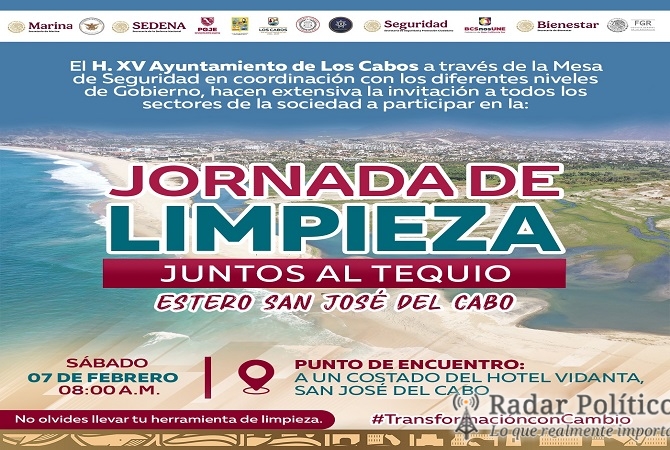 Los Cabos, BCS.- El XV Ayuntamiento de Los Cabos, a través de la Mesa de Seguridad y en coordinación con los diferentes niveles de Gobierno, hace una extensiva invitación a todos los sectores de la sociedad para participar en la jornada de limpieza denominada «Juntos al Tequio», la cual se realizara en el Estero de San José del Cabo el próximo sábado 07 de febrero a partir de las 08:00 de la mañana.