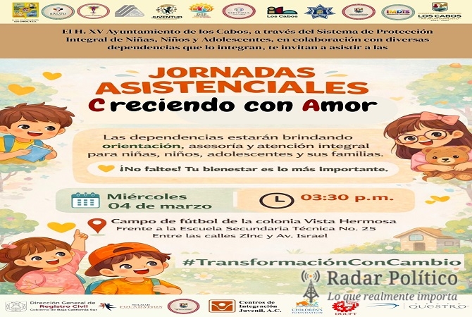 Los Cabos, BCS.- Con el objetivo de fortalecer el acercamiento con la comunidad y brindar atención directa a la niñez y adolescencia del municipio, la Secretaría Ejecutiva del Sistema Municipal de Protección Integral de Niñas, Niños y Adolescentes (SIPINNA) realizará una jornada asistencial en la colonia Vista Hermosa.
