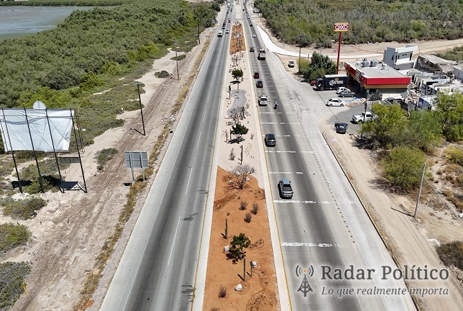 Explicó que ya concluyeron dos kilómetros de obra, los cuales ya cuentan con sistema de riego mediante la red púrpura. Además, se tienen avances en el paisajismo y la conformación del camellón central, integrando cuencas de captación de agua y vegetación endémica, como parte del modelo de Camellones Choyeros que promueve el uso eficiente del agua tratada.